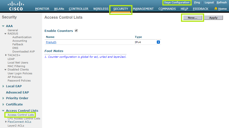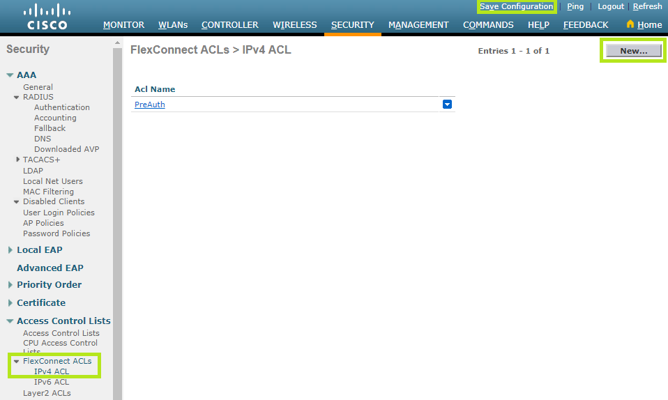 Scroll down to PreAuthentication Access Control Lists and click External WebAuthentication ACLs.