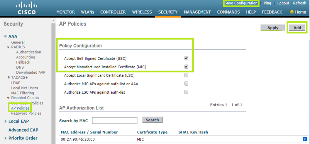 Click the Add button to access the Add AP to Authorization List section. In the MAC address field, enter your AP MAC address. In the Certificate Type field, select “MIC”.