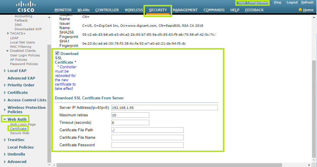 From the Security menu at the top, select Web Auth > Certificate.