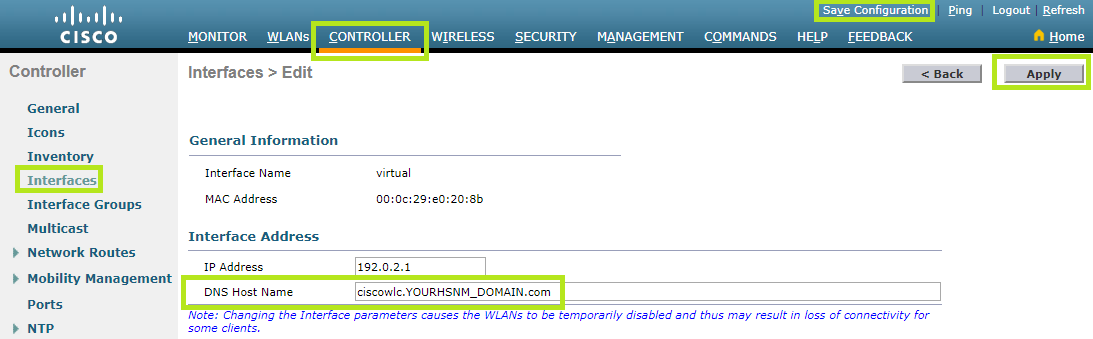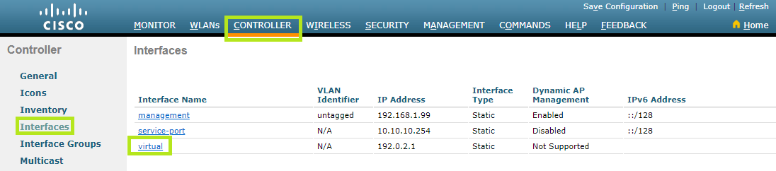 Select the Controller menu at the top and then click Interfaces on the left. Now find and click “virtual” below Interface Name in order to edit it.
