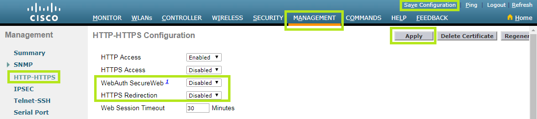 Select the Management menu at the top and then click SNMP > HTTP-HTTPS on the left.