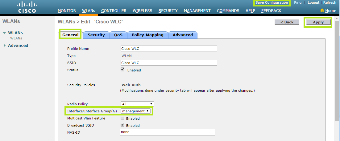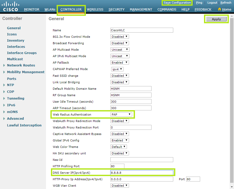 Once completed, click the Apply button and Save Configuration.