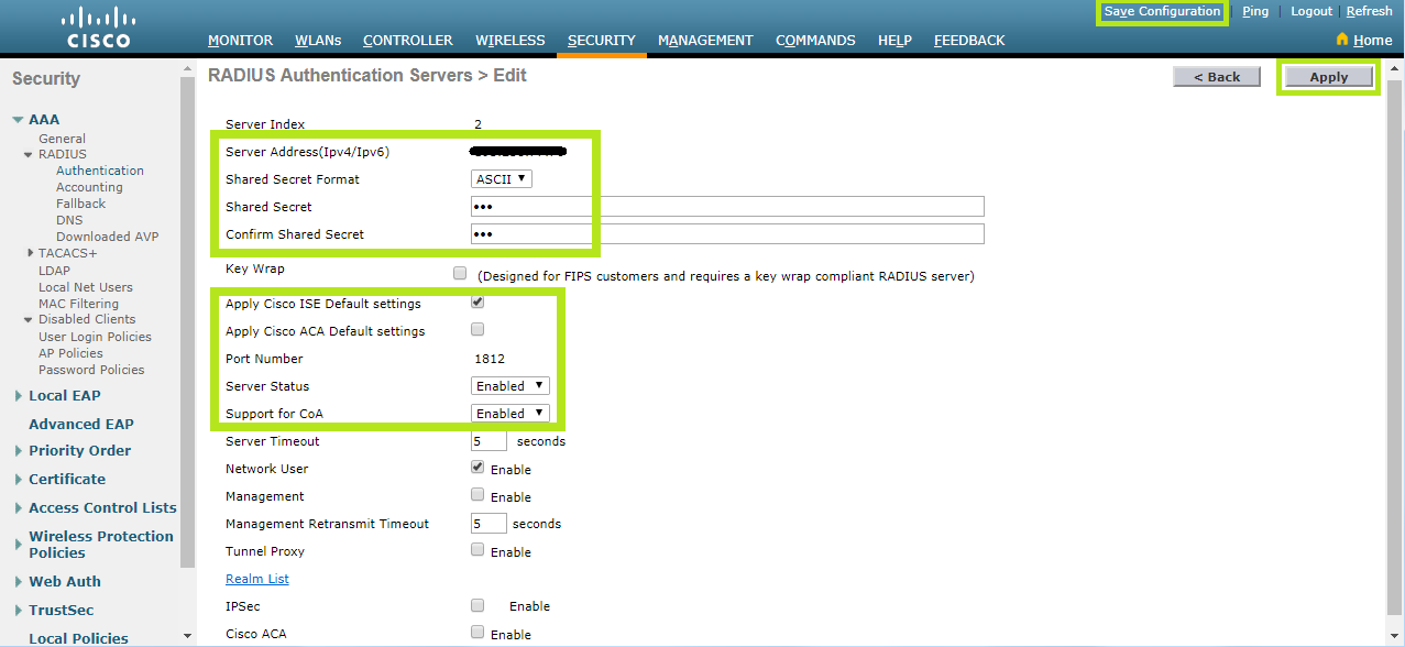 Click the Security tab at the top, then click the RADIUS menu on the left and scroll down to Authentication.
