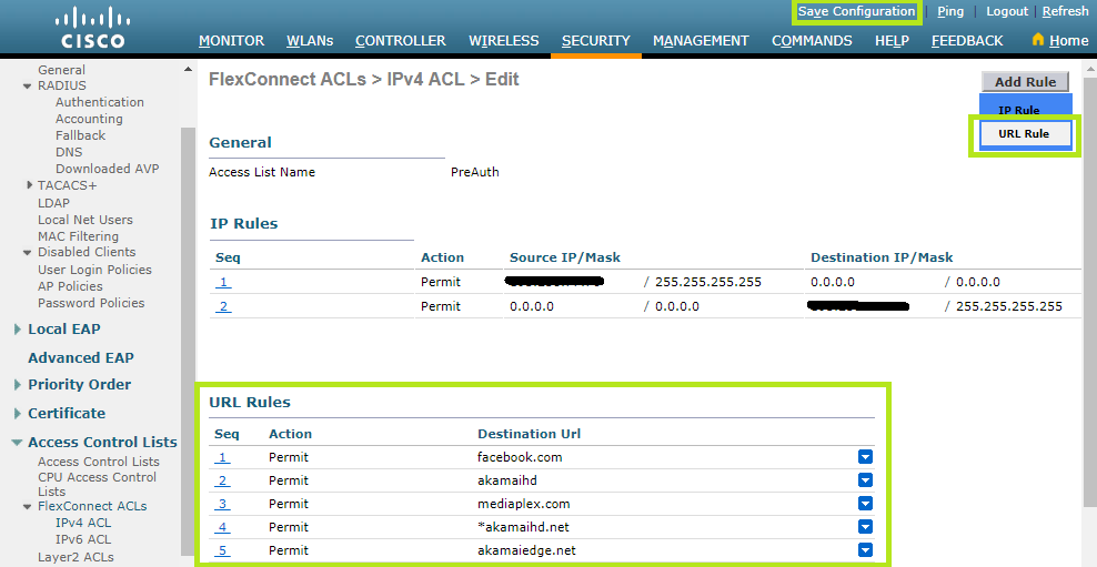 From the IPv4 ACL menu, you can also configure the walled garden. Just click the Add Rule button, in the top right corner, and then select URL Rule.