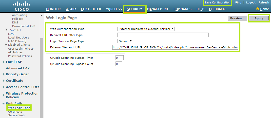 In the External Webauth URL field, enter http://YourNetwork Station_IP_OR_DOMAIN/portal/index.php?domainname=YourDomainName&hotspotname=YourHotspotName&ciscowlc=