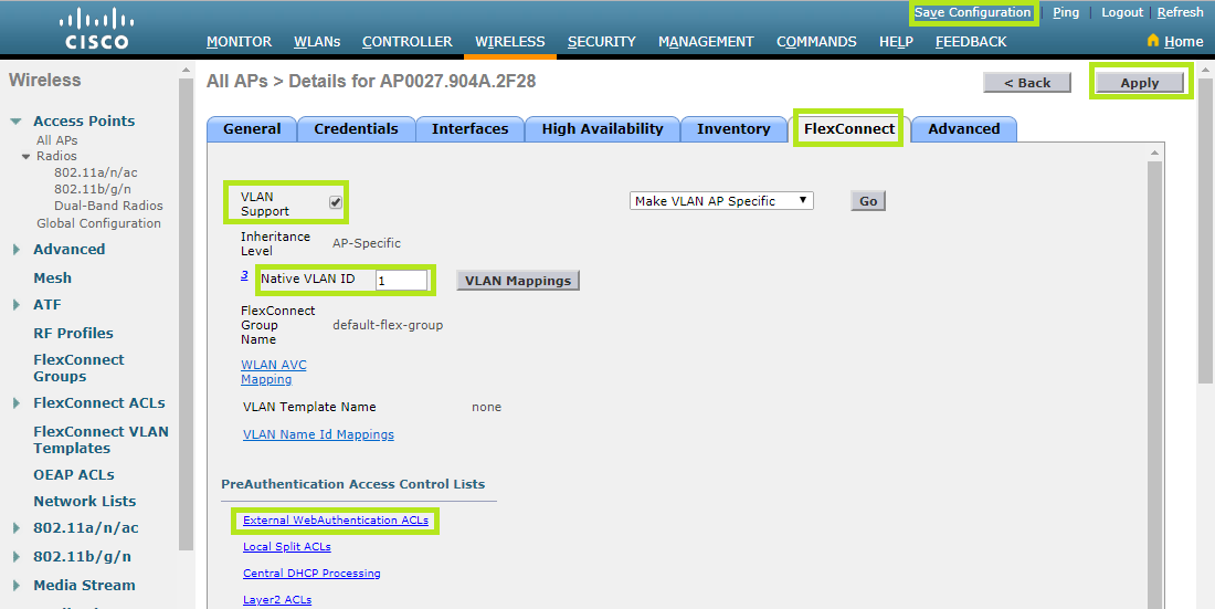 Move to the FlexConnect tab. Tick WLAN Support, then enter “1” in the Native VLAN ID field.