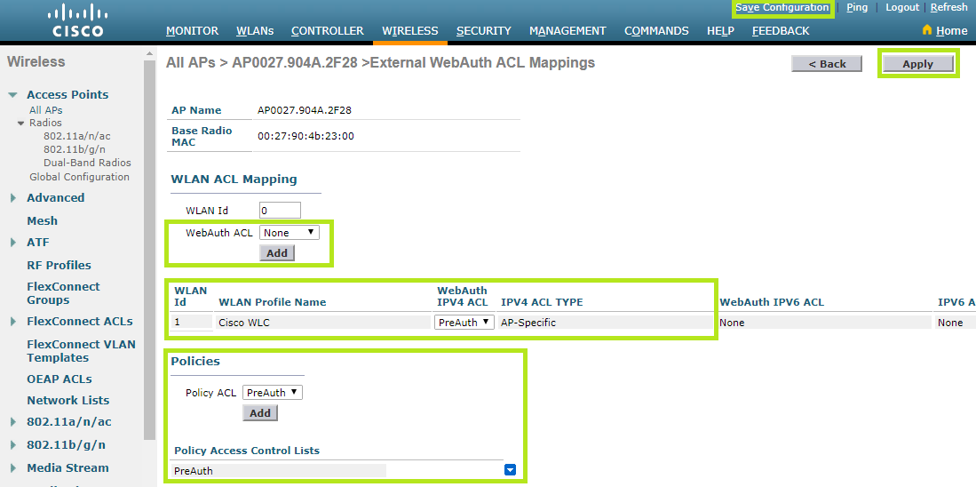 Here you have to set ACLs you have previously created to both WLAN and Policies section. The image below shows all the steps.