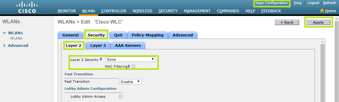 Then, move to the Securitytab and select the Layer 2 section. In the Layer 2 Security field, select “None”.