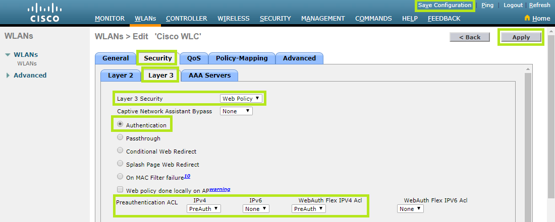 Now move to theLayer 3section. In the Layer 3 Security field, select “Web Policy”. Below, tick “Authentication”.