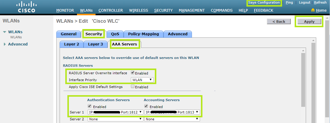 From the Security tab, select the AAA Servers section. Enable the RADIUS Server Overwrite interface and select “WLAN” in the Interface Priority field.