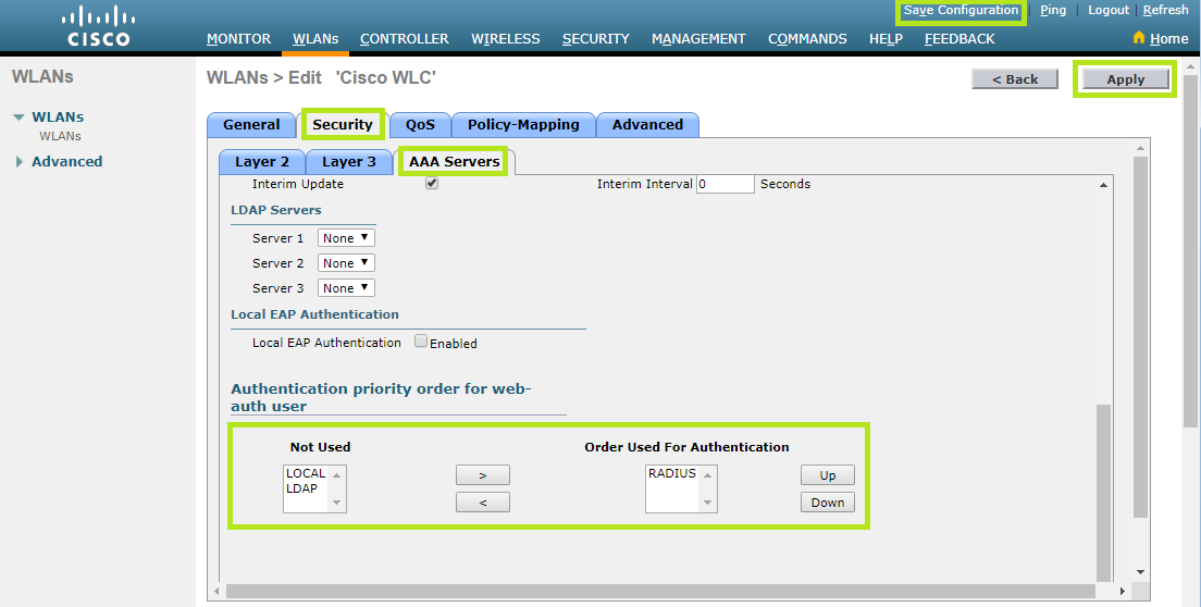 Scroll down to Authentication priority order for web-auth user section and make sure that “RADIUS” is set as the only item.