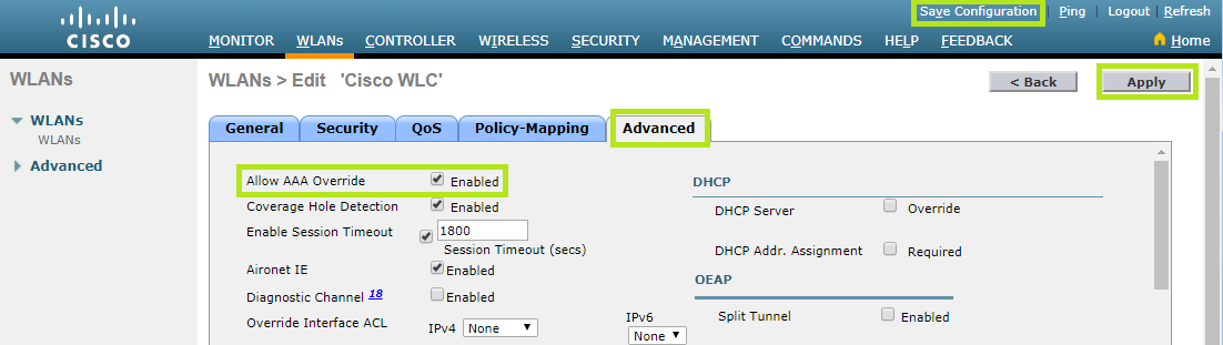 From the Security tab, move to the Advanced tab. Enable Allow AAA Override.