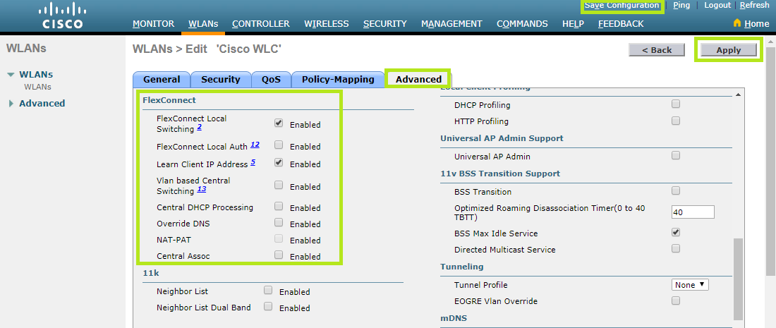 Scroll down to the FlexConnect section and enable FlexConnect Local Switching 2and Learn Client IP Address 5.